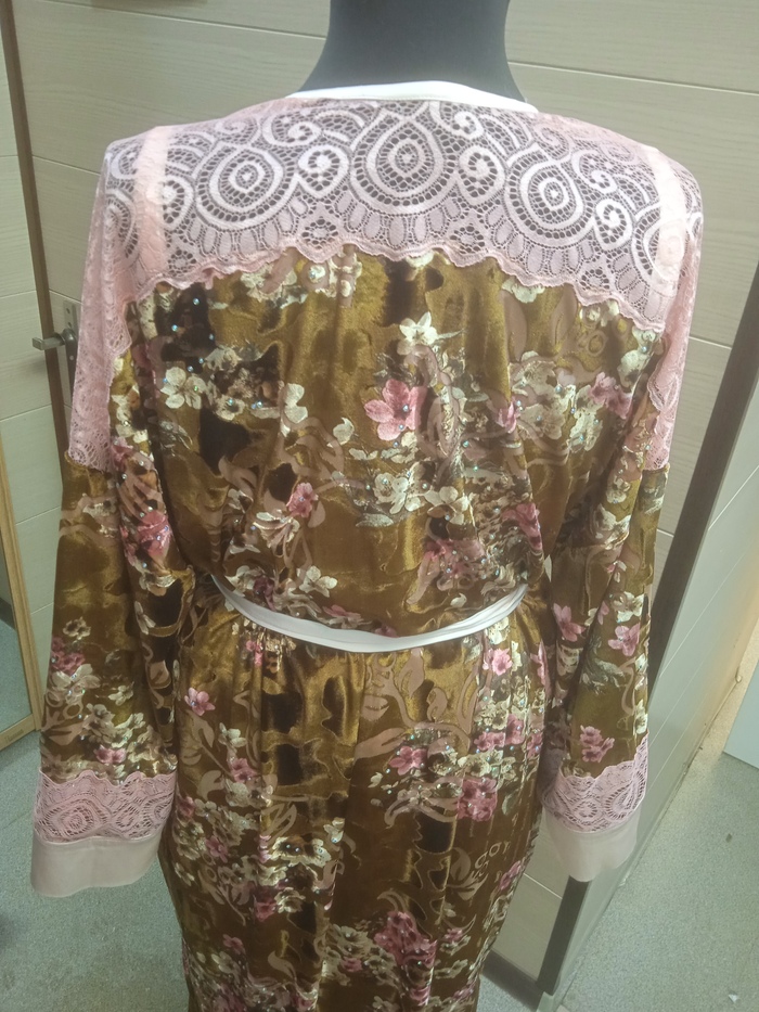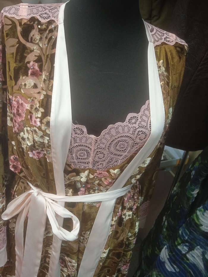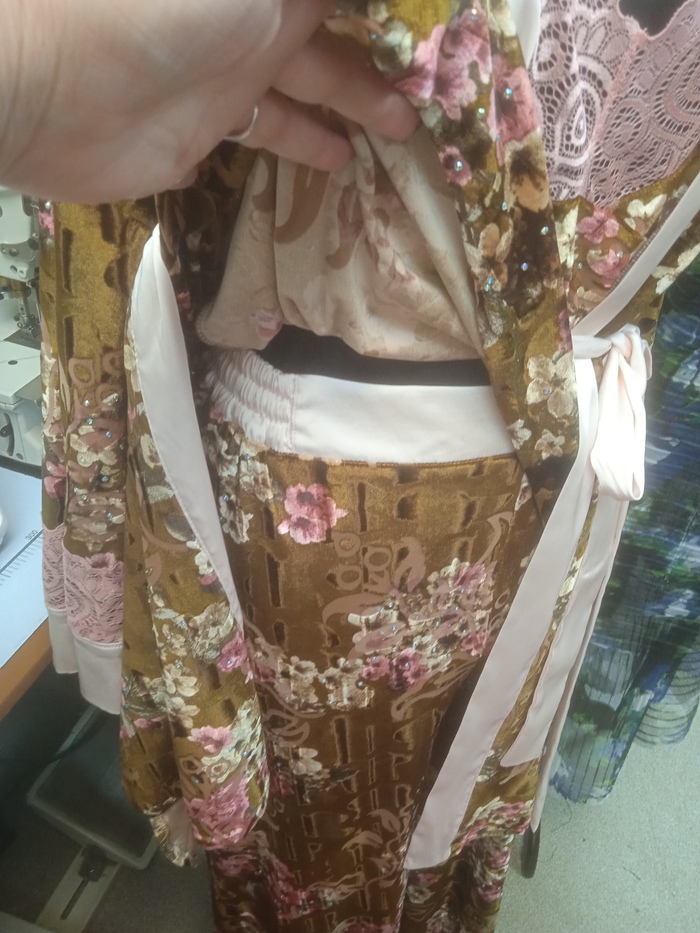 Дареному коню никуда не заглядывают ведь? Лет пять назад перепал мне отрез бархата деворе узбекского разлива. Отдала клиентка, ей тоже подарили. Перекладывала его из одного кофра в другой, из тюка в тюк,пережил два переезда и не потерялся. Периодически доставала, впечатлялась стразиками, крепко зажмуривалась и прятала куда-нибудь с глаз долой. Ну вот честно - был бы просто деворе (вытравной) бархат, так у него ещё и ломаный волнистыми линиями ворс, ещё и цветочки букетами, ещё и стразики. Цыгане-медведи, крч. Хотя по составу очень даже, вискоза и все такое, к телу очень приятный. В общем, я решилась. Кружево в тон цветочков, бледно-розовый атлас - а первый попавшийся, захотелось чем-то светлым разбавить. Штанишки на резинке, топ на бретельках с регуляторами и халатик. Сидя у окна, томно пить кофе и чувствовать себя немного Шахерезадой. Всё равно из этого узбекского великолепия больше ничего не придумалось, а перекладывать надоело. И да, я такое люблю и ношу. Манекен мелкий, я побольше буду везде. Сшила за сегодня, утром как вдохновилась, так и сделала.