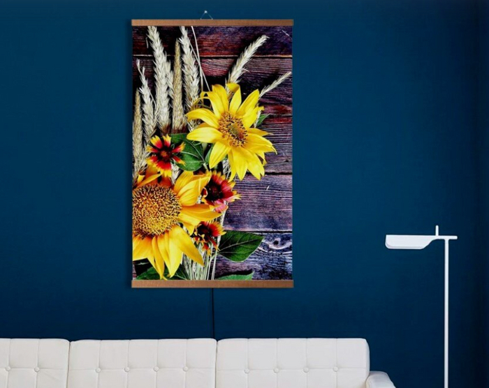 Обогреватель обладает гибкой структурой, позволяющей ему легко принимать различные формы, в данном случае, он представлен в виде картины "Подсолнухи", что делает его не только полезным, но и декоративным элементом.