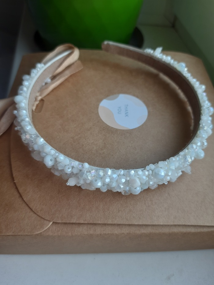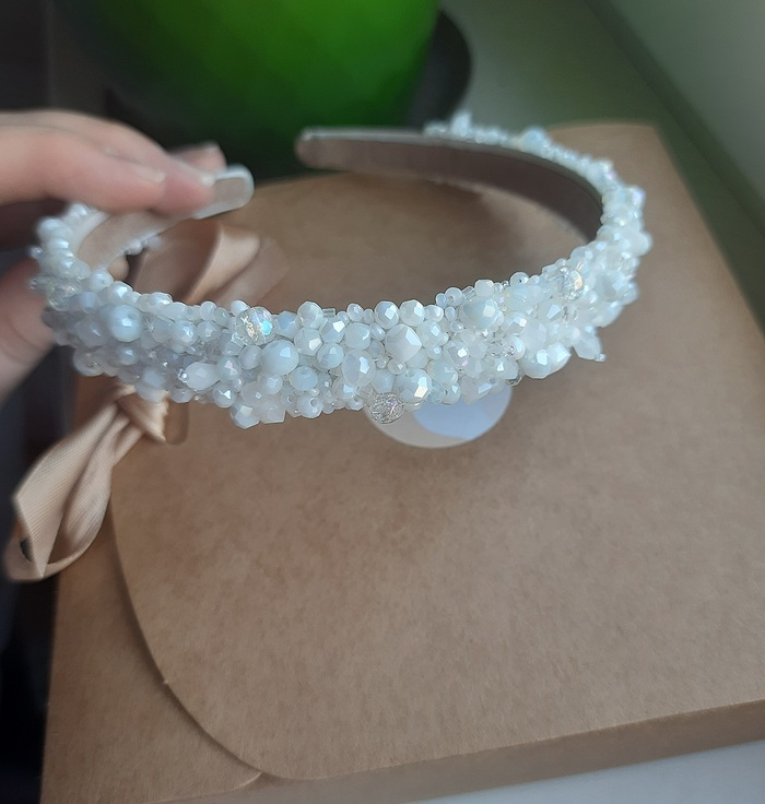 Его преимущества: не цепляет волосы, мягкая тонкая ткань на изнанке; ушкам вашим сильно мешать не будет, т.к. на концах ободок не обшит бусинами; идеально дополняет образ невесты.