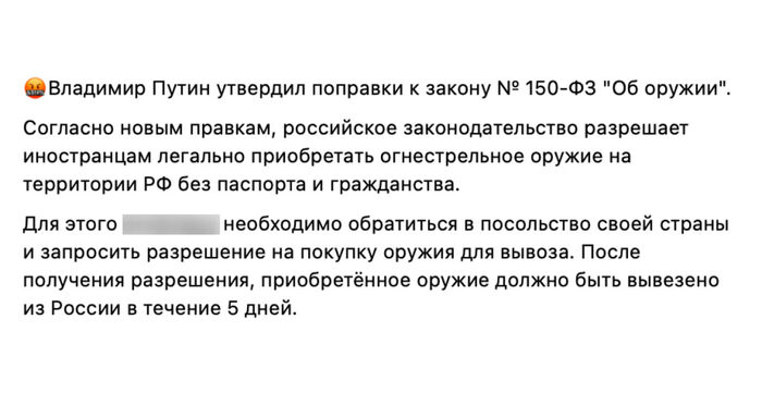 В Сети пишут, якобы Президент России Владимир Путин подписал поправки в Федеральный закон «Об оружии», разрешающие иностранным гражданам приобретать огнестрельное оружие в России без паспорта, медицинской комиссии, обучения и стажа. Сообщение вызывает серьёзную тревогу у пользователей, создавая впечатление, что в стране введён бесконтрольный доступ к оружию для иностранцев.