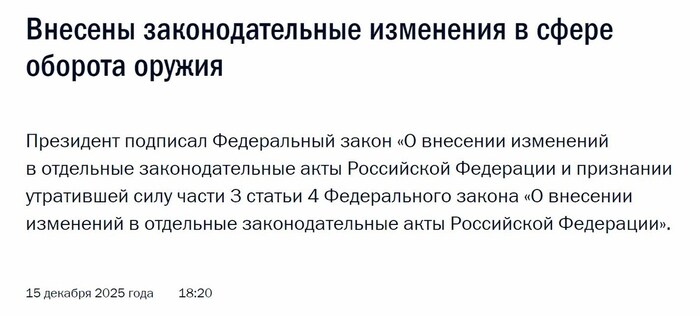 Эта новость не имеет ничего общего с реальностью. На самом деле 15 декабря 2025 года Президент действительно утвердил изменения в закон «Об оружии», но они касаются исключительно регулирования оборота спортивного оружия, порядка аннулирования ранее выданных лицензий, а также проверки на соответствие криминалистическим требованиям.
