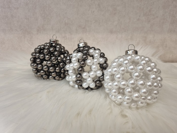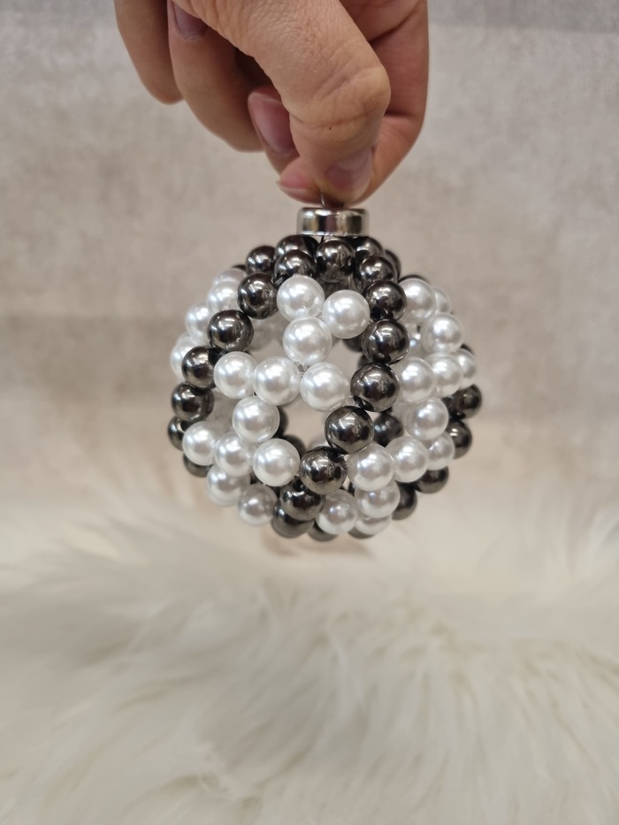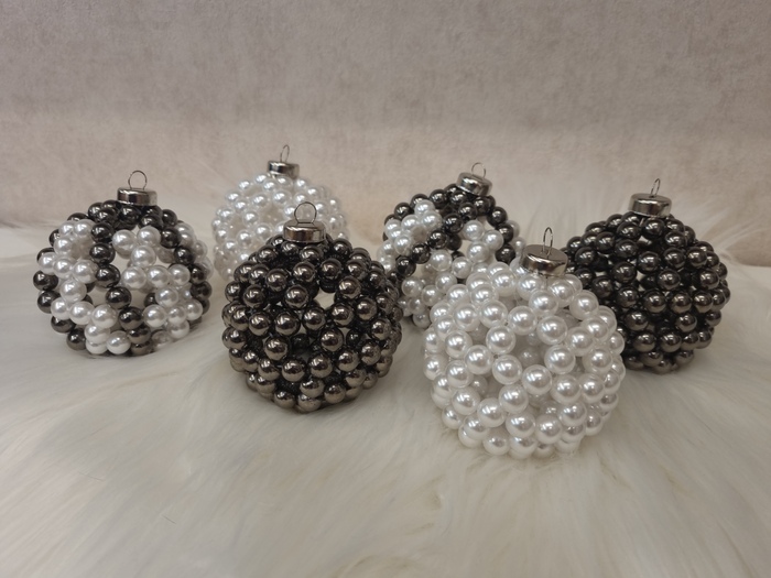 Это то, что я уже плету с закрытыми глазами. В этом году на Новый год прямо бум был на шары из бусин — разноцветные, с определённым узором, из стеклянных бусин. У кого на что фантазии хватает!