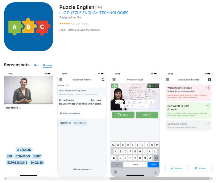 Мобильное приложение Puzzle English доступно для скачивания в AppStore, Google Play, App Gallery. Функционал сервиса на смартфоне не урезан, поэтому вы можете воспользоваться коллекцией бесплатных видеоуроков и тренажеров, а также оформить подписку на дополнительный контент.