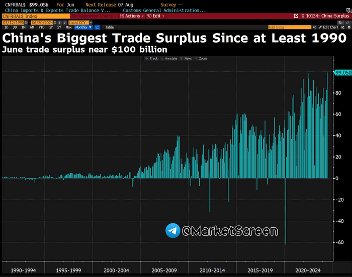 А пока США вводит санкции в отношении Китая, в Китае в июне месяце случился рекордный профицит торгового баланса в истории. Практически 100 млрд $.