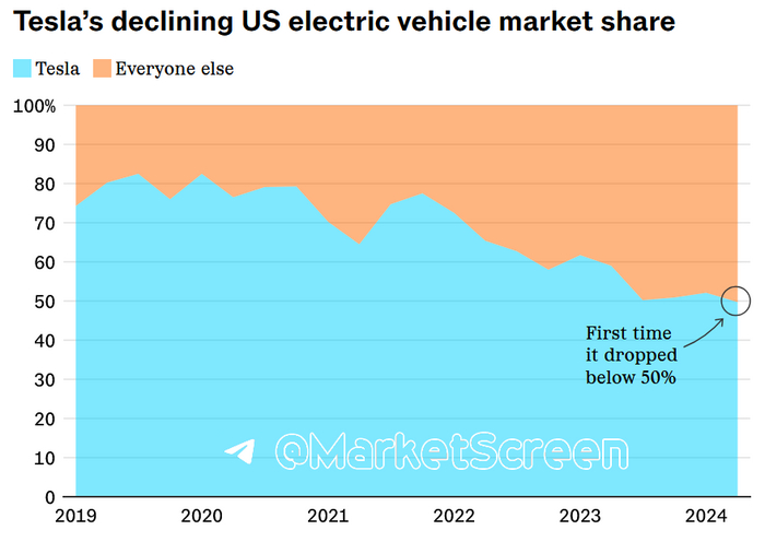 Согласно новым данным Cox Automotive, Tesla, которая когда-то занимала практически весь рынок электромобилей в США, теперь впервые контролирует менее половины этого рынка. В то время как продажи Tesla в США во втором квартале снизились примерно на 6% по сравнению с предыдущим годом, по словам Cox, общие продажи электромобилей выросли на 11%, поскольку покупатели обращаются к многочисленным конкурентам компании.