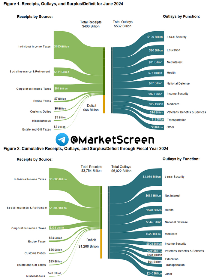 В июне 2024 он составил 66 млрд $, что гораздо лучше, чем майские 347 млрд $. Но такие колебания могут быть. Налоги, еще что. А вот за текущий финансовый год, который начался в октябре 2023 уже все 1,268 трлн $.