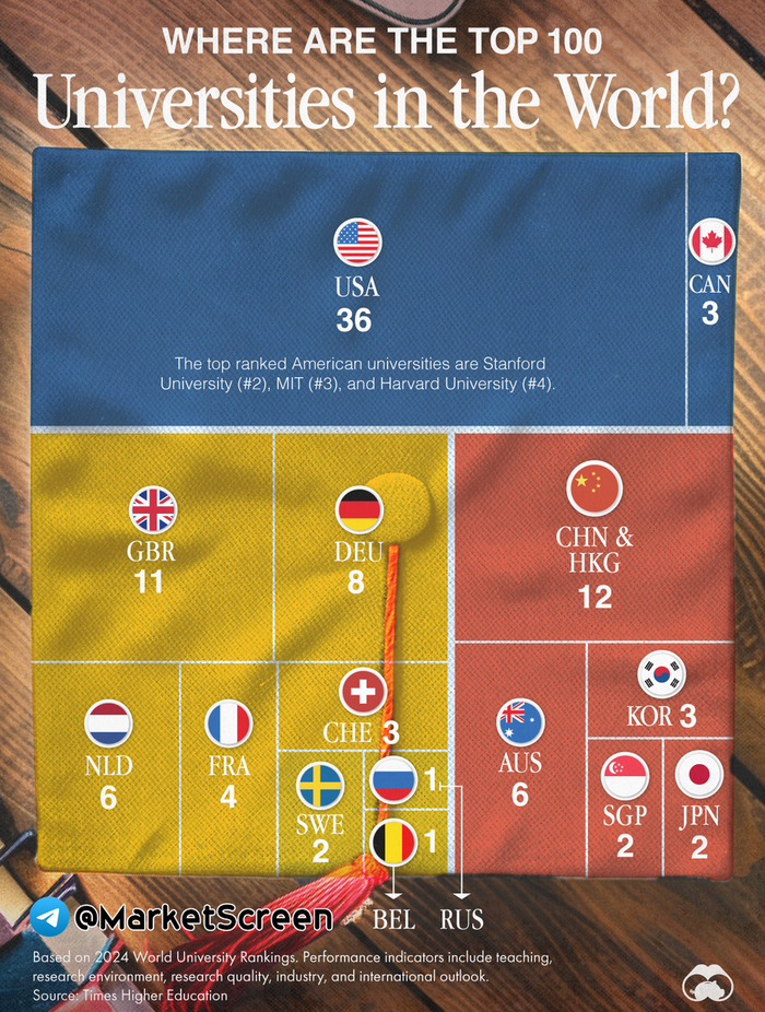 США доминируют в сфере высшего образования. США не только входят в топ-100 лучших университетов (36), но и являются самой представленной страной (169 университетов) во всем рейтинге, включающем почти 2000 учебных заведений.