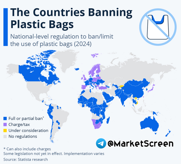Согласно документу Организации Объединенных Наций и сообщениям СМИ, проанализированным Statista, 91 страна и территория в мире ввели полный или частичный запрет на пластиковые пакеты.