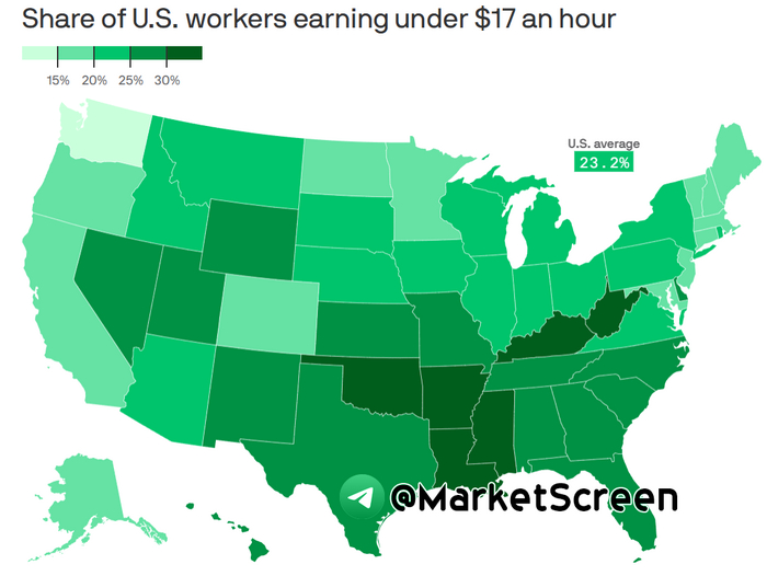 К штатам с самой высокой долей низкооплачиваемых работников относятся такие, как Миссисипи, Оклахома и Техас, где федеральный минимум составляет 7,25$ в час.