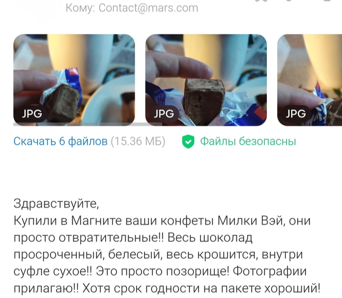 Многие из нас думают, что уж крупный, тем более иностранный производитель, будет нести хоть какую-то ответственность за продажу испорченного товара покупателю. Тем более такой шоколадный гигант как Mars (ООО "Марс"), который вроде как гордится своей репутацией. Что, наверное, он отвечает на письма, пришедшие на официальный почтовый ящик и хоть как то компенсирует потребителю ущерб от покупки некачественной продукции.