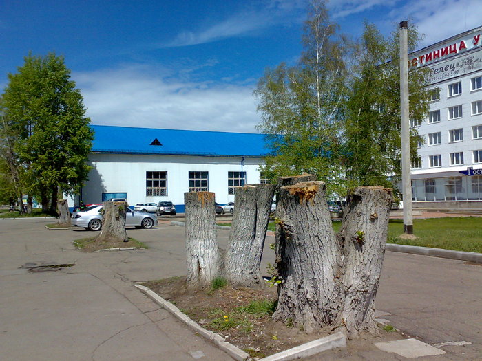 А на центральной площади однако перестарались с обрезкой. Да, это не спиленные деревья, это такая обрезка.