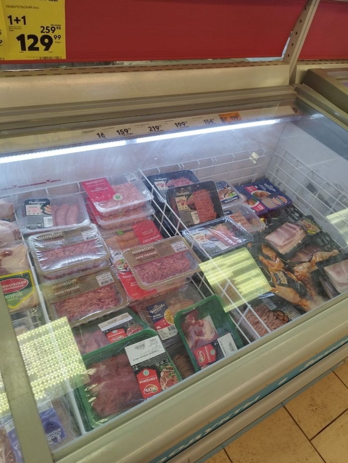 Рядом с отделом Овощи/Фрукты расположились лари-бонеты с охлажденной продукцией. В них разместились разнообразные полуфабрикаты из мяса и птицы. 🍗🥩