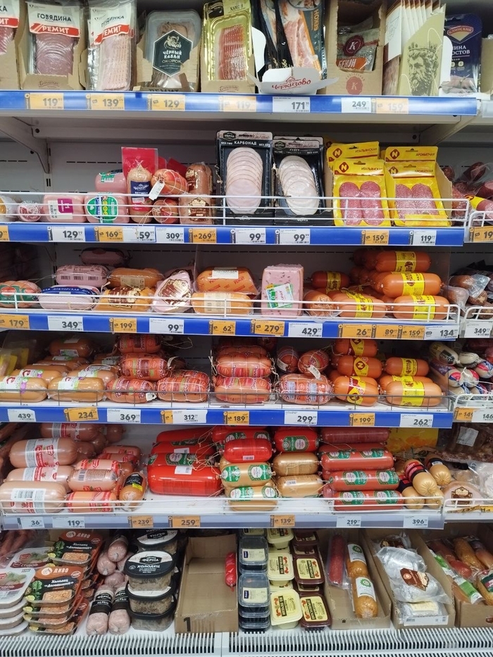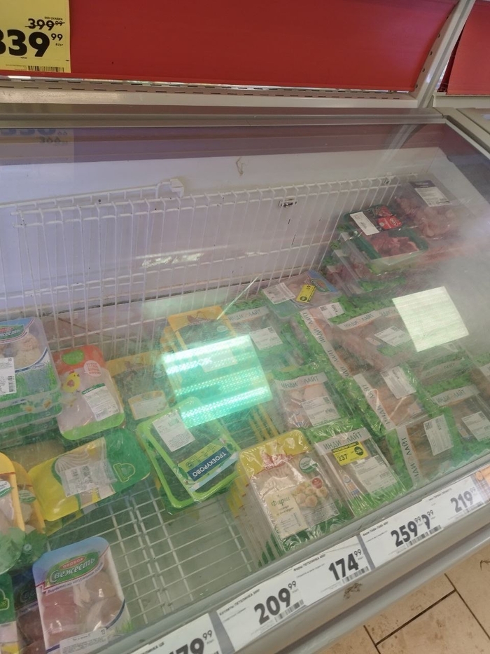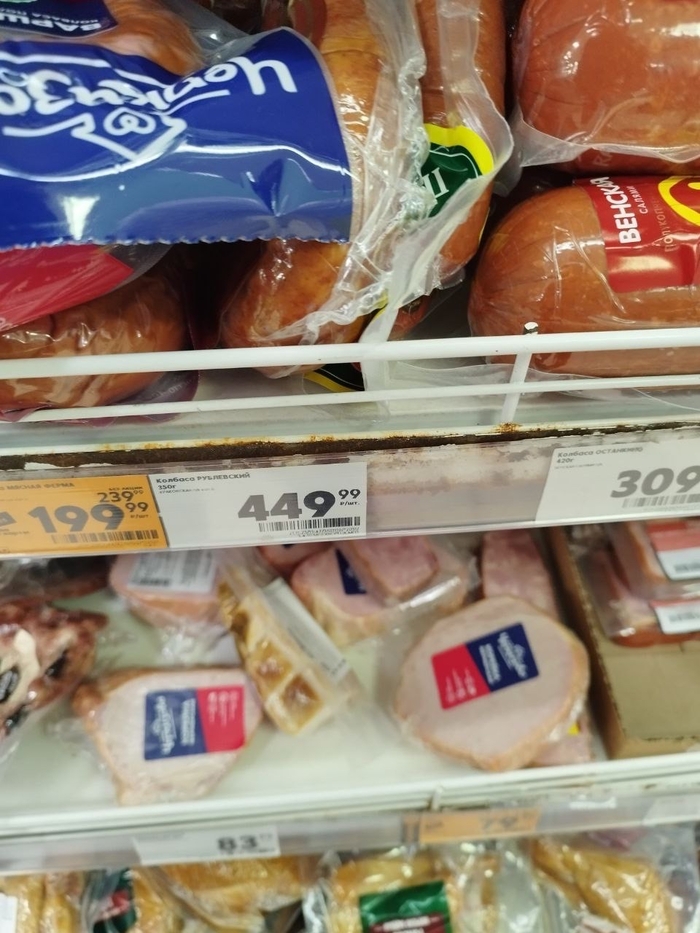 Ложкой дëгтя,в очередной раз, стали ржавые полки в отделе с мясной гастрономией. Для большего привлечения взгляда покупателя, полки подсвечены жёлтыми ценниками! ⚠️❗️