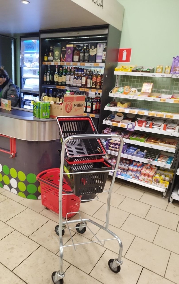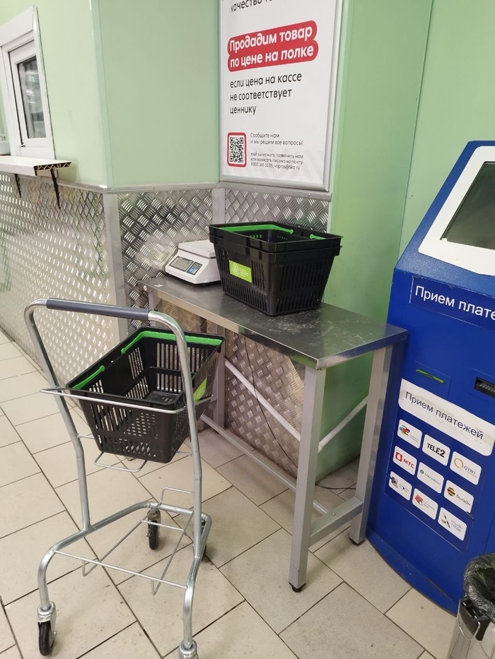 Около кассы много брошенных покупательских корзин, стол для упаковки продуктов также заставлен корзинами. 🛒