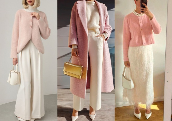 Пастельно-розовый подойдёт для любого сезона. Весной и летом-платья, рубашки, лёгкие костюмы. Осенью и зимой-пальто, жакеты и сумки. Он делает образ свежее и аккуратнее.