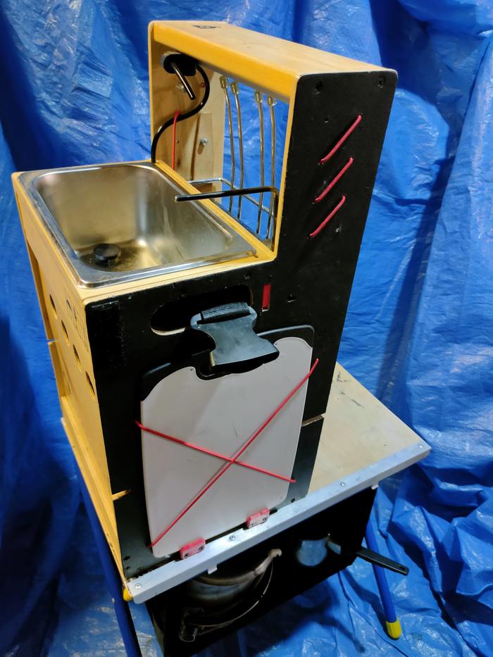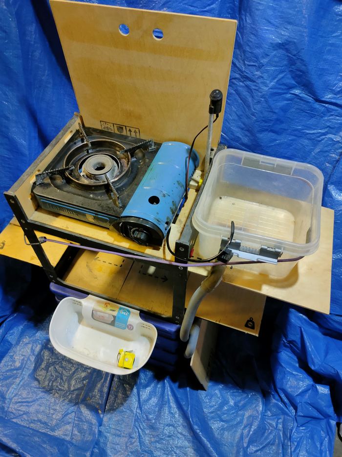 Газовая плитка установлена сверху, вставлена ножками в ответные углубления и легко снимается (ведь в ней нельзя было иначе заменить баллон :)). Рукомойник - это раковина из пластикового ящика, с врезанным сливом (очень глупое решение: пластик тяжело отмывается от жира, особенно такой вот формы, с прямыми углами по периметру), и отдельно - подвод воды: насосик, шланг, провода к выключателю, провода к аккумулятору. Аккумулятор нужно было поставить где-то рядом с кухней, всё это соединить, подключить... ну вы понимаете :))