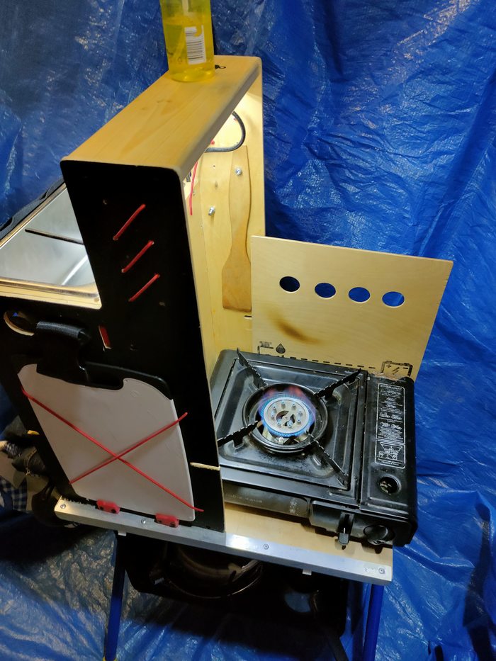 Родилась вот такая конструкция: раковина стационарно установлена над канистрой и аккумулятором, плитка сделана откидной, без какой-либо дополнительной крышки. Посуда почти вся "едет" в раковине и рядом с ней, а шанцевый инструмент - внутри ящика, в небольших простых сумочках-кармашках. В верхней части жёсткая верхняя полка - с нижней стороны на ней смонтированы две полоски мощной светодиодной ленты с выключателем, а на верхнюю часть можно что-то класть в процессе готовки (и это реально очень удобно - гораздо удобнее всяких боковых откидных полочек).