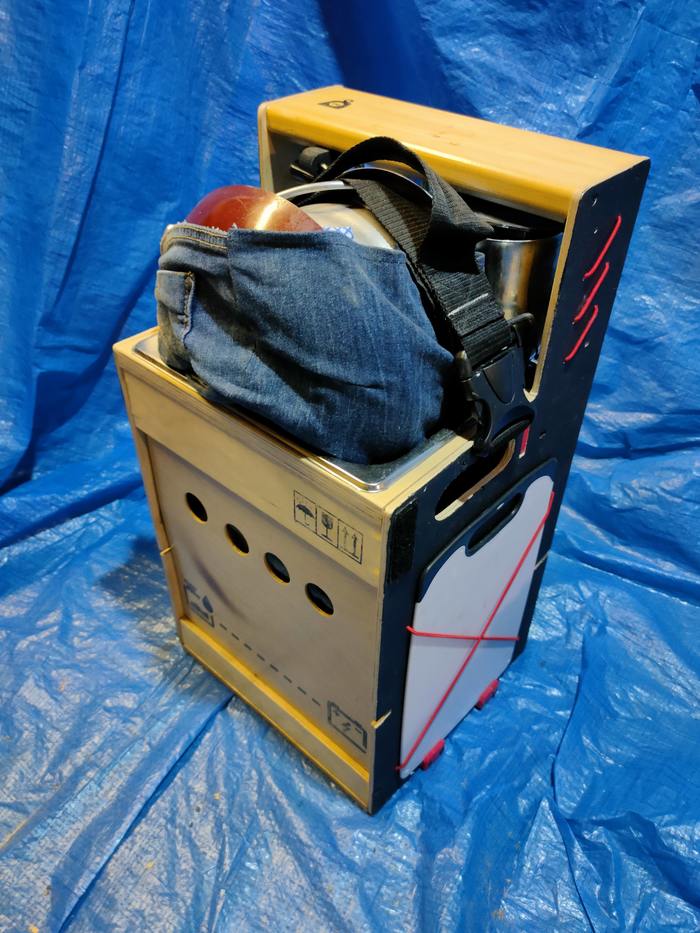 Вот он, до сих пор хранит остатки того комплекта. Чемоданчик, хоть и занимал больше места в машине, был намного удобнее в использовании, но всё же это была просто сумка, и меня не покидала мысль собрать всё это в некоем ящичке, в котором бы кухонная утварь не только ехала, но и сразу могла бы быть использована, по приезду на место.