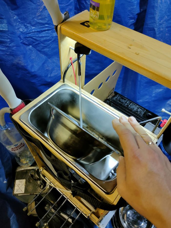 Ничего проще и надёжнее чтобы мыть посуду на природе придумать невозможно, это факт. Но - нужно дерево, чтобы повесить его, и мужская сила, чтобы пополнять. Краники на канистры - по сути тот же умывальник с теми же минусами, только ещё не сподручно туда грязную озёрную воду лить. Поэтому и искались электрические варианты, и желательно с раковиной.