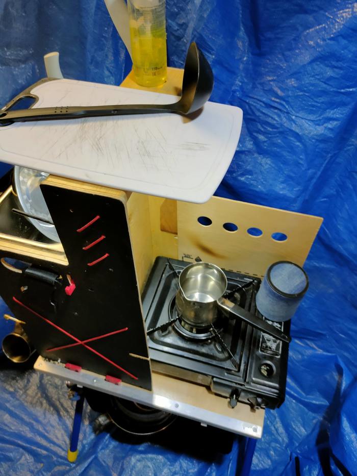 Здесь я уже совершенно осознанно и в полной уверенности плясал от связки "вода-свет-плитка", но с важными коррективами. Плитку не стремился разместить наверху в центре кухни: это бред, внизу гораздо проще защитить её от ветра, и готовить так гораздо удобнее (даже "гражданские" правила эргономики рекомендуют устанавливать варочную поверхность ниже, а никак не выше основной рабочей поверхности) , и жир со сковородки летит только на стенки "экранов", а не по всей кухне. Раковина должна была быть обязательно из нержи с гладкими углами - взял гастроёмкость. Вода и свет должны были быть жёстко и полностью смонтированы на чакбоксе. Аккумулятор и канистра с водой - на борту, внутри. Никаких нахер откидных полочек, максимум - крючки или что-то вроде.