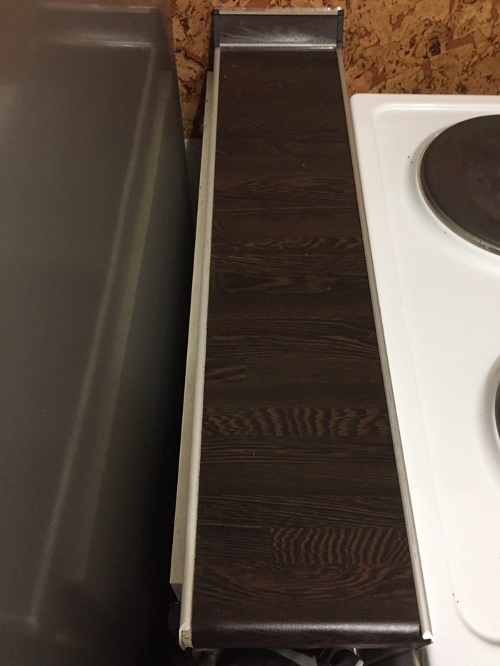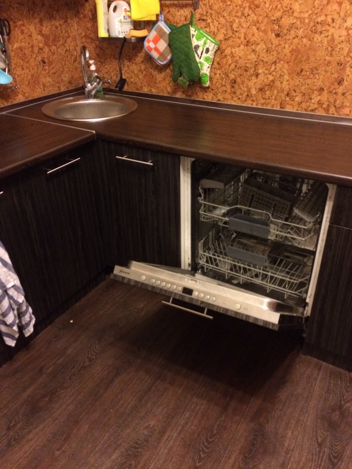 Затем поехал в магазин за дополнительными шкафами, мойкой и фурнитурой. Столешницу взял из ЛДСП 305х3.8х60 см. По моим подсчетам длины должно было хватить, но подруга отдала встраиваемую посудомоечную машину и в итоге не хватило 1,5-2 сантиметра на ящик для специй. Но это не особо видно. Оставил так, как есть.