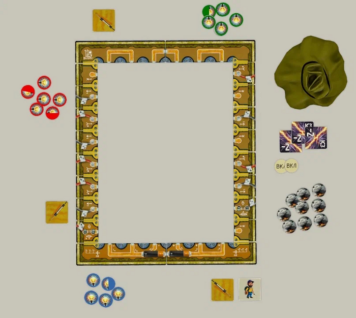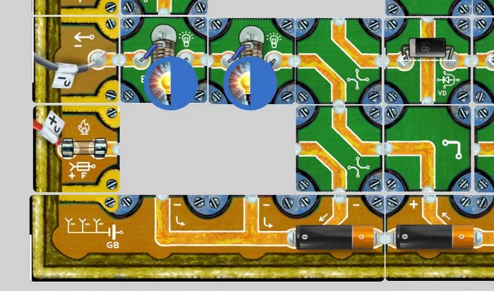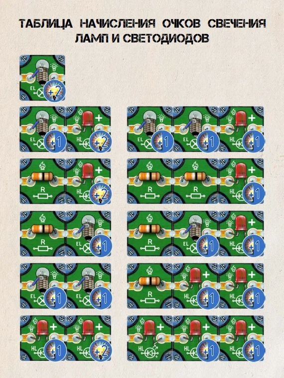 Сперва все просто: берете жетон Элемента из мешка, выкладываете его на свободное место игрового поля и строите цепочку от "плюса" к "минусу", чтобы в ней оказались лампочки (а лучше одна) или резистор со светодиодом. Очки начисляются по таблице и зависят только от числа компонентов в замкнутой цепи, а не от их порядка.