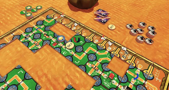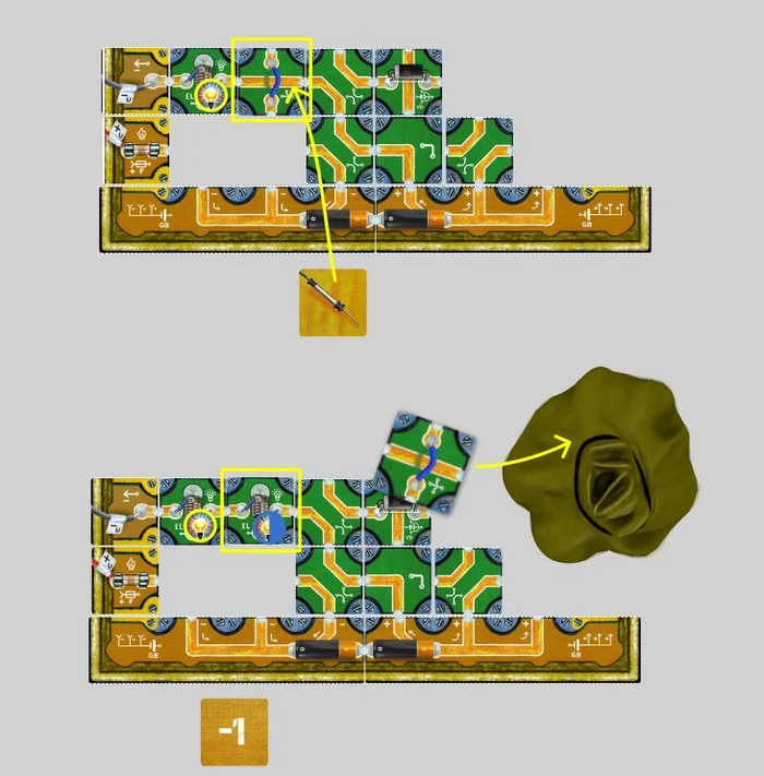 Далее играть становится чуть сложней: свободных мест на поле все меньше, а выкладывание жетона может помочь не только вам, но и сопернику. Игроки начинают не только собирать свои цепочки, но и мешать сделать это соперникам. Появляются ошибки, начинают подгорать компоненты и устраиваться короткие замыкания (КЗ).