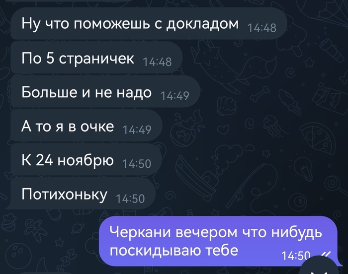 Как он назвал научную статью докладом это финиш. Ноутбука у него нет, в академии тоже нет компов, задачи ему ставят невыполнимые, постоянно в нарядах и глаза не сомкнуть. Ладно, шут с ним, накидываю ему текста, хотя мало вообще понимаю в радиосвязи.