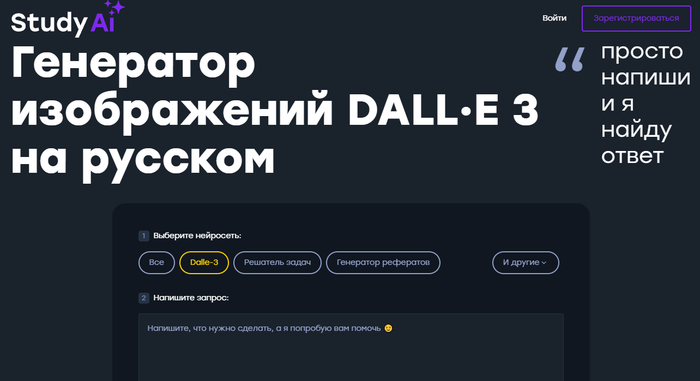 Передовая нейросеть от OpenAI, специализирующаяся на генерации детализированных изображений по текстовым описаниям, которая особенно хорошо справляется с созданием концептуальных и сюрреалистических визуальных историй для экспериментальных комиксов. Доступ к DALL-E 3 через Study AI обеспечивает полную поддержку русского языка, интуитивный интерфейс и мгновенную генерацию изображений прямо в браузере без необходимости установки программного обеспечения или знания английского.