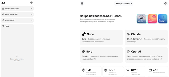 GPTunnel — универсальный сервис с доступом к множеству нейросетей через один интерфейс.