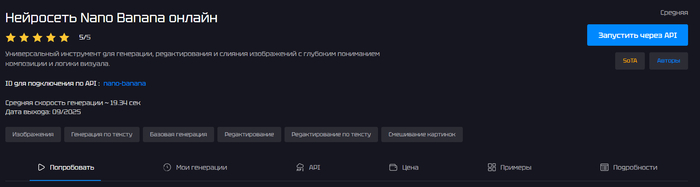 Nano Banana — компактная и быстрая модель генерации изображений через API с высокой скоростью работы и качеством результата.