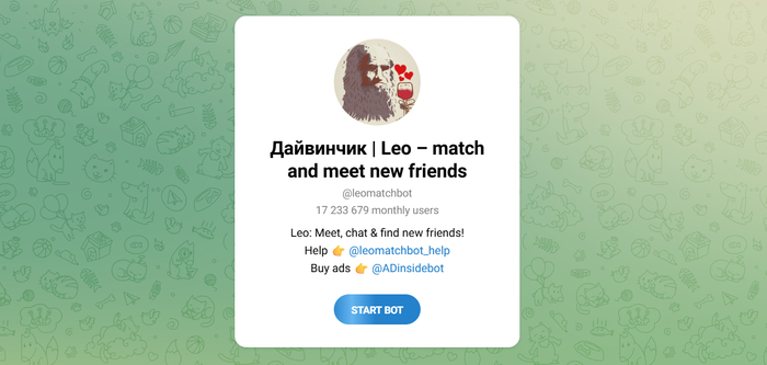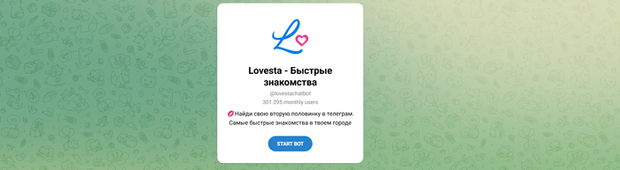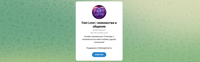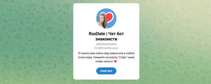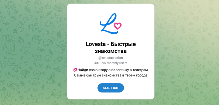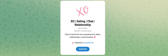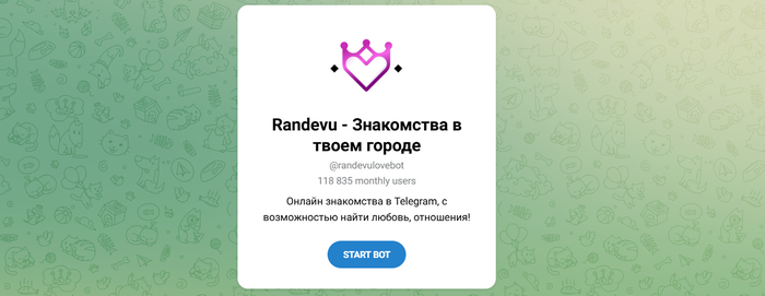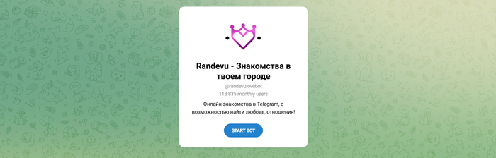 Этот бот тесно связан с классическим сайтом знакомств, так что можно и просто поболтать, и перейти к более серьёзному общению — удобно, если хочешь смешать возможности Telegram и традиционных платформ.