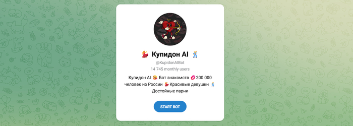 Этот чат-бот будет полезен тем, кто хочет познакомиться с кем-то серьёзно, но предпочитает удобство Телеграм для первых шагов.