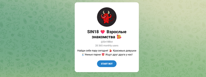 SIN18 — бот, ориентированный на более «взрослые» знакомства и флирт без строгих обязательств. Хороший вариант для коротких разговоров и весёлых переписок в формате чат-бота.
