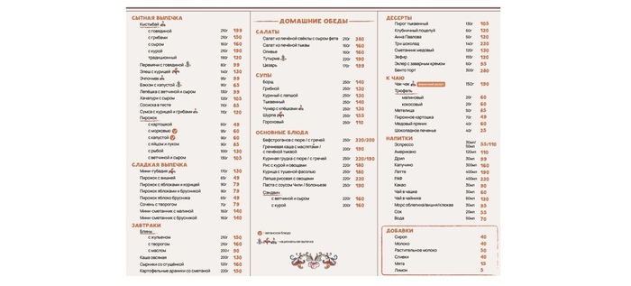 Это уже обновлённое меню после нескольких переделок. Так всё выглядело на момент закрытия проекта. Цветовая палитра изменилась в связи с обновлением интерьера в заведении, но открытия после ремонта не случилось.