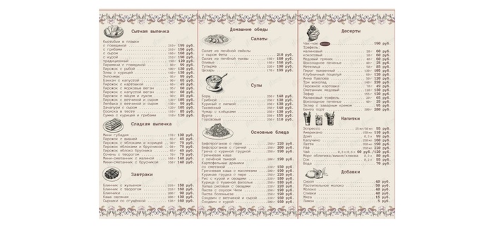 Это первая вёрстка меню в три сложения. Первый макет собирал дизайнер из типографии, а вторым макетом занимался уже мой дизайнер, с которым мы стали сотрудничать. Думаю, что отличия очевидные.