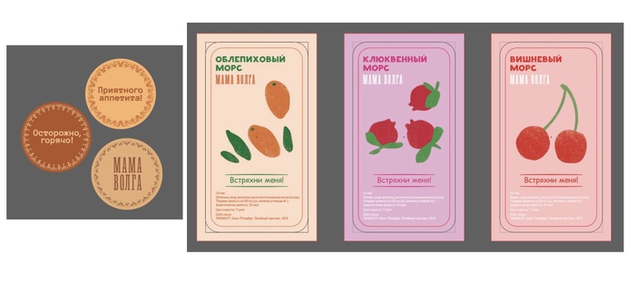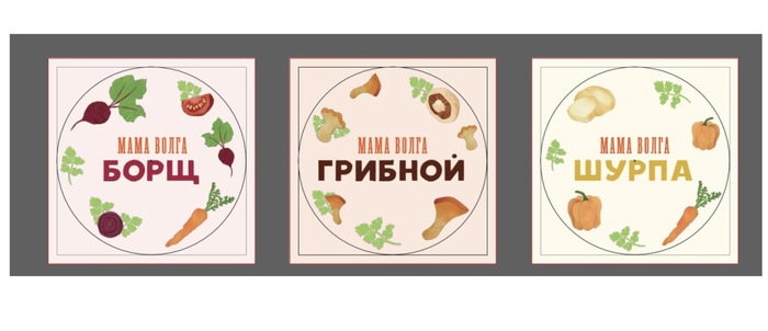 Далее мы начали работу над наклейками на крафт пакеты и этикетками для морсов и супов. Для наклеек решили использовать ранее разработанные узоры, чтобы подчерунуть национальные особенности продукта. В этикетках сделали акцент на натуральность продукта (домашняя еда как у татарской бабушки). Каждый элемент ягоды, овощи отрисовывали отдельной иллюстрацией. Все эти милые рисунки классно вписываются не только в полиграфию, но и в контент для социальных сетей.