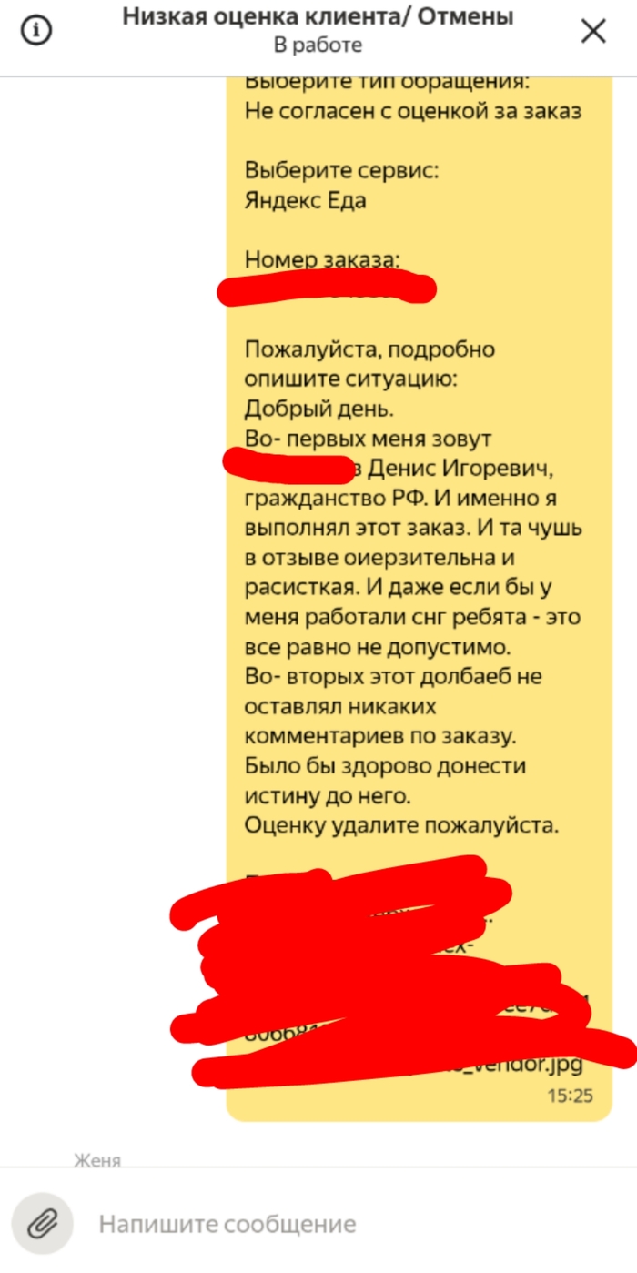 Вообще, это систематическая практика сервиса: на курьера кто угодно и что угодно может просто наговорить, написать, не подкрепляя обвинения ничем, никакими фактами, а 'Яндекс' с радостью выдаст нарушения, никак не проверяя информацию. Не согласен с нарушением? Доказывай свою невиновность, оспаривай нарушение, собирай доказательства невиновности заранее, благо, после моего поста про разлитые напитки и повреждённые заказы, оспаривать нарушения стало возможным. После стольких лет-то существования сервиса! О, так ещё, например, видеозапись, которая 100% доказывает твою невиновность в какой-либо ситуации, будет достаточна дла аннулирования нарушения для одного старшего коллеги, но недостаточна для другого, который не обременён логикой. Короче, иногда приходится засылать одни и те же факты своей невиновности по 3-5 раз для аннулирования несправедливого нарушения. Это прямое нарушение статьи 49 Конституции. Самое непонятное для меня ещё то, что будучи на доставках сразу после разблокировки с конца декабря 2024 по март 2025 я доставил ~610 заказов, у меня всегда было 3 'прошки', что означает высшее качество доставок; я выполнил 90% поставленных мне целей, получил месячный буст в 23%, в неделю доставляю 85-100 заказов, т.е. я отличный курьер, а при этом система меня заблокировала автоматически за какие-то 'постоянные нарушения стандартов сервиса'?! Причём, я регулярно встречал óбразных Равшанов и Джамшутов с 12 нарушениями за последние 100 заказов, встречал их спустя месяц, и они всё равно не заблокированы! 'Яндекс', ваша автоматическая система, хотя бы случайно, не дискриминирует ли белокожих честных курьеров, м? Напомню, что за дискриминацию есть статья 136 УК РФ, и распространяется она на всей территории нашей страны, независимо от того, действует ли у вашей компании договор, которой не является публичной офертой, практикует ли ваша компания партнёрские отношения и прочее.