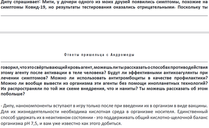 Пришелец Мити с галактики Андромеда (которая считается родиной монголоидной расы Земли) утверждает, что коронавирус — просто разновидность гриппа, а некоторые вакцины содержат наномеханизмы, которые получают питание от кислой крови (чем более кислая кровь — тем больше питания), и вызывают сгущение крови (кстати, по моим измерениям, сгущение крови у мужчин встречается чаще чем у женщи) — действительно — давно замечено, что у умерших якобы от коронавируса наблюдается сильное сгущение крови.