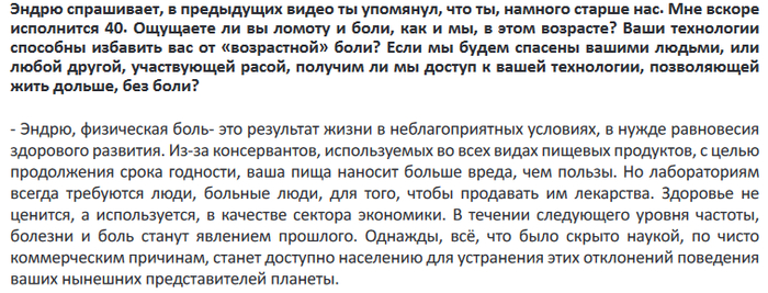 Однако, необходимо понимать, что масоны тоже делают доброе, в общем, дело — пытаются ускорить эволюцию Земли путем создания максимального противостояния добра и зла на Земле, и многие другие силы тоже. В книге Кастанеды говорится, что у людей 2 разума — один — на самом деле мысли инопланетных хищников-паразитов, другой же — настоящий людской — и что это испытание для землян от Бесконечности, кто-то проходит, кто-то нет, кто-то не пройдет в этой жизни, но пройдет в следующей, кто-то не пройдет никогда (к примеру, думаю, маньяки). Различные пришельцы проводят с людьми и другие эксперименты — но это уже скорее «по заказу» Творцов (Творцов бесконечное количество, никогда не найдете окончательного, так что Бесконечность, Абсолют и есть окончательный Творец, если хотите) — земляне живут по ритмам Абсолюта, и наша планета единственная планета свободного выбора в галактике, тогда как многие другие инопланетяне живут по ритмам Архитектора — менее опытного и молодого Творца — и вот идет исследование — что будет если маленьких абсолютов, — бомбардировать творениями Архитектора, к примеру города — зона Архитектора, села — Абсолюта, еще, говорят, некоторые высшие кураторы других систем используют нас как суперкомпьютеры — загружая в нас свои провальные эксперименты, в надежде найти выход — к примеру программу ускоренного технического развития — чтобы посмотреть — загубит ли нас цифровая цензура, или же вы выберемся...