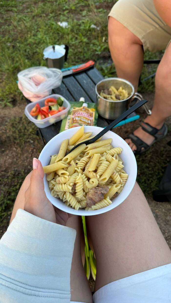В этот раз в меню паста с томленой говядиной в сливочном соусе (макароны с тушенкой и мазиком) и кофе с вафлями 😋
