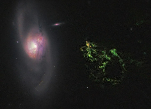 Светящееся Привидение: Объект не содержит звезд. Он светится исключительно за счет ионизации газа мощным излучением. Но источник этого излучения – квазар в центре IC 2497 – уже потух как минимум 100 000 лет назад! Почему же газ все еще светится?
