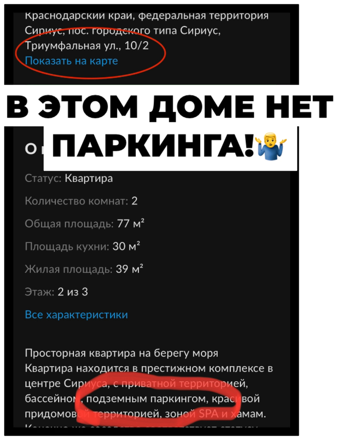 Здесь об упущении самого хитреца. Если он не заметил, что случайно добавил фото с подземной или уличной парковки, вы сами можете легко узнать, имеется ли вообще в этом комплексе таковая.