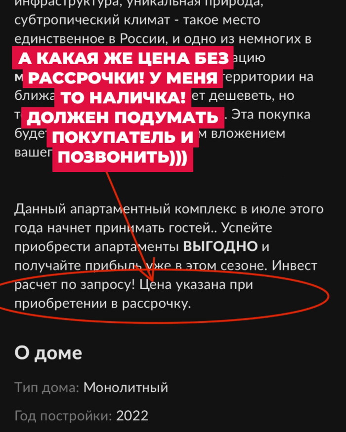 А дальше дело техники. Обычно это фразы вроде: «Да, все верно, вот эта квартира. Но она стоит на 5 млн дороже. Мы просто указали минимальную цену на квартиры в этом комплексе»…