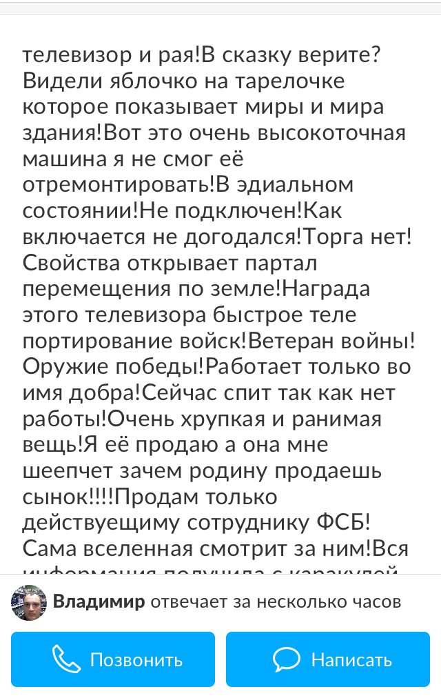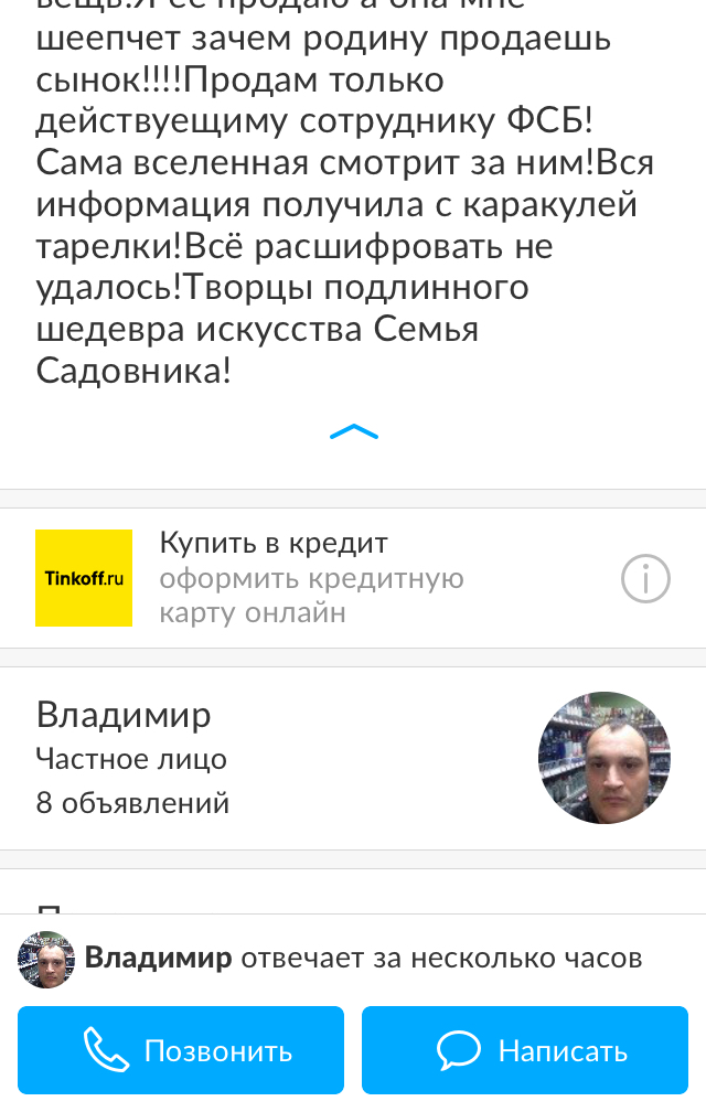 15 vsevolod16 Когда тебя напоили и пытаются продать 9 лет назад Показать полностью 1 Авито Объявление Упоротость Дятлы Вуди вудпекер
