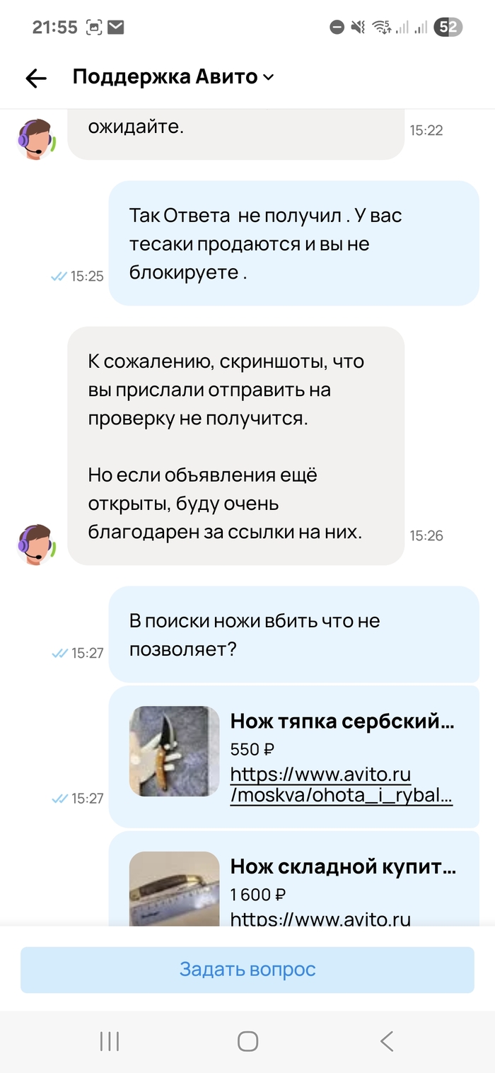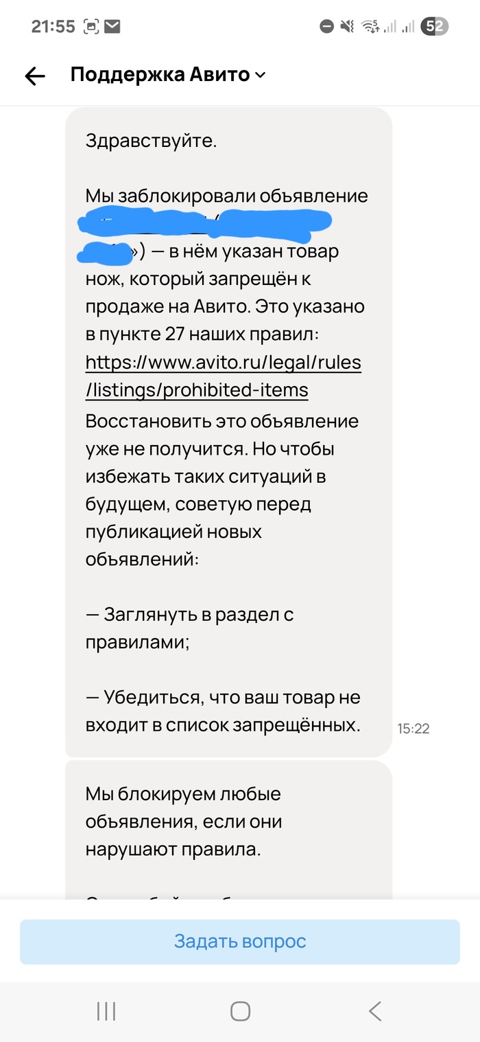 Недавно захотел продать не нужный ножечек , но после размещения объявления прилетел бан без возможности восстановить объявление .