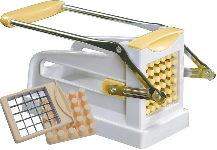 Кому из нас не хочется иногда забабахать целую сковородку жареной картошечки? У меня даже специальная чугуниевая сковородка есть, огромная и тяжёлая, ничего кроме картошки на ней не жарю. Так вот, овощерезка на фото превращает десяток картофелин в аккуратные одинаковые брусочки меньше чем за минуту. Как и чугунную сковородку, использую только для нарезки картофеля. Редко — кабачков. Есть две сменные решетки — с ячейками потолще и потоньше.