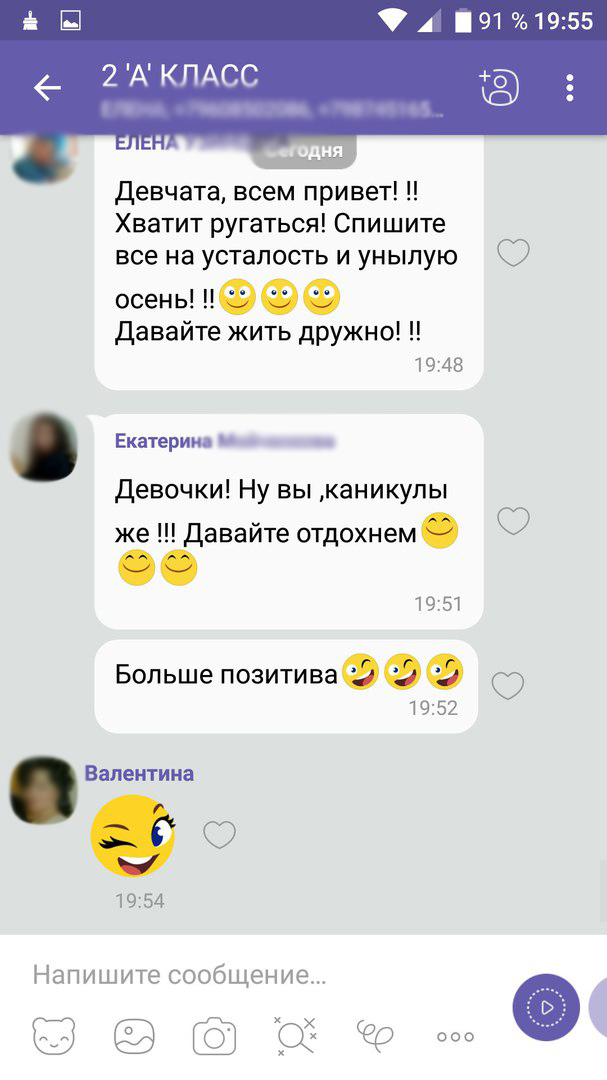 Мой сын ходит во 2 класс. Все хорошо, кроме группы в viber, которую создал род. комитет. Я рада бы отписаться, но иногда там бывают очень важные сообщения. Но в основном стикеры, смайлики и открытки "с добрым утром", "спокойной ночи", ура каникулы и всякая хрень, которая пиликает круглосуточно и теперь в мое расписание входит убавление звуковых сигналов перед сном и прибавление - с утра. Но это было бы терпимо, если бы мамочки не были против любых моих высказываний, что незаконно платить за охрану, что я не собираюсь собирать макулатуру по помойкам, что пока я и мои дети слегли с температурой, то мы не пойдем ни на субботники, ни на собрания. К слову активность проявляю, помогаю, чем могу. Всегда, когда могу, сопровождаю на мероприятия, фотографирую... Но нет! Они против меня с 1 класса) Любое мое высказывание - это повод показать себя высшим существом. Мне очень хочется материться