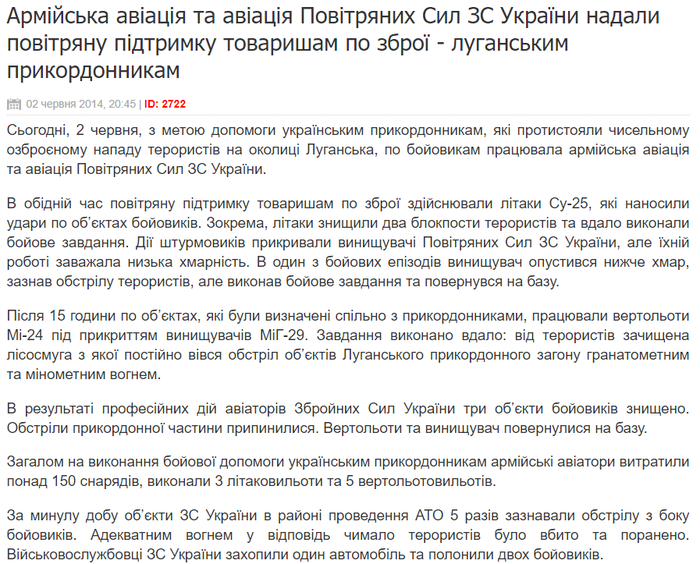Самой сдержанной была позиция Минобороны, которое заявило, что самолеты действительно летали в районе Луганска - штурмовики Су-25 и истребители Миг-29. Также были задействованы вертолеты Ми-24.