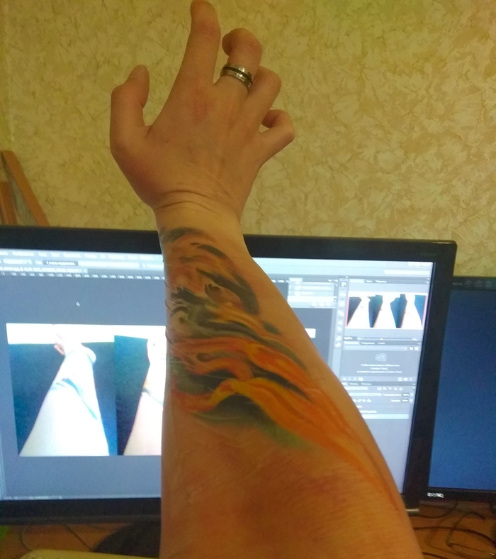 Загорелся я лет 5 назад сделать себе тату. Но все никак не было то времени, то денег, а потом и вовсе женился (не делайте так не взвесив все + и -)... Сейчас уже официально как разведен, и я подумал: "Время пришло, пора осуществлять свои мечты". И вот в течении полутора лет я вынашивал план, точнее эскиз, который я хочу и где. Я не умею рисовать, хотя фантазия то есть и примерно представлял, как все должно выглядеть. Пошел сначала в наш тату-салон, который стоит на первом месте 2гис (на первом месте, не реклама, а просто на первом). Очень много отзывов (примерно 90/10, Хороших/плохих), что обнадеживало. Я надыбал парочку интересных фотографий с тату, чтобы дать понять мастеру, чего я хочу. На первой консультации, мне сказали, что это 6-7 сеансов, и приходить на следующей недели, чтобы обсудить эскиз (он тоже оплачивается, как оказалось, я не знал). По совету двух знакомых девушек (Спасибо вам Света и Женя) я направился в другой тату-салон, который оказался на 3 или 4 странице 2гиса. Рассказал мастеру, что я хочу, показал эскизы, которые я скачал из интернета. Собственно, он ответил: "Окей, я понял что ты хочешь, приходи через 2 недели я нарисую, обсудим". 2 недели пролетели не заметно и вот я весь в предвкушении увидеть эскиз и надолго засесть за его правки... Но я оказался не прав, мастер понял меня абсолютно верно и правильно, выполнив все как я крутил в голове но не мог представить цельный образ. Мне понравилось с первого взгляда. Я в нетерпении хотел сразу приступить к работе, но мастер сказал что сейчас может выполнить только обводку, а остальное на втором сеансе через 2 недели, либо сразу за 1 сеанс, но через 2 недели. Я спросил: "Как лучше?", Он ответил: "Лучше за один". Я не специалист и доверился ему. Хоть ждать не было уже мочи... И вот время сеанса 12 часов дня, я прихожу и мы начинаем готовится. Приступили ровно в 13:00 (вроде), я боялся по большей части боли, яж не знал каково это и как. Но поначалу оказалось совсем не больно и я хмыкнув сказал: "Да фигня какая не больно даже...". Как же я был не прав. Боль, как оказалось накопительная и под конец сеанса я хотел забиться в угол и плакать как маленькая девочка обняв колени :) Но я стойко терпел и не подавал виду. Больно когда проходят по второму разу по уже набитой тату, что бы подправить контуры, дорисовать, исправить недочеты (Если я не прав специалисты напишите, как это правильно). Больно на руке в области сгиба локтя и на кисти. Короче мой вам совет, запаситесь обезбаливающим и закиньтесь после часа сеанса. В общем выехали мы в 22:20 вроде по домам, со всеми перекурами примерно 7-8 часов боли и страдания, зато каков результат!